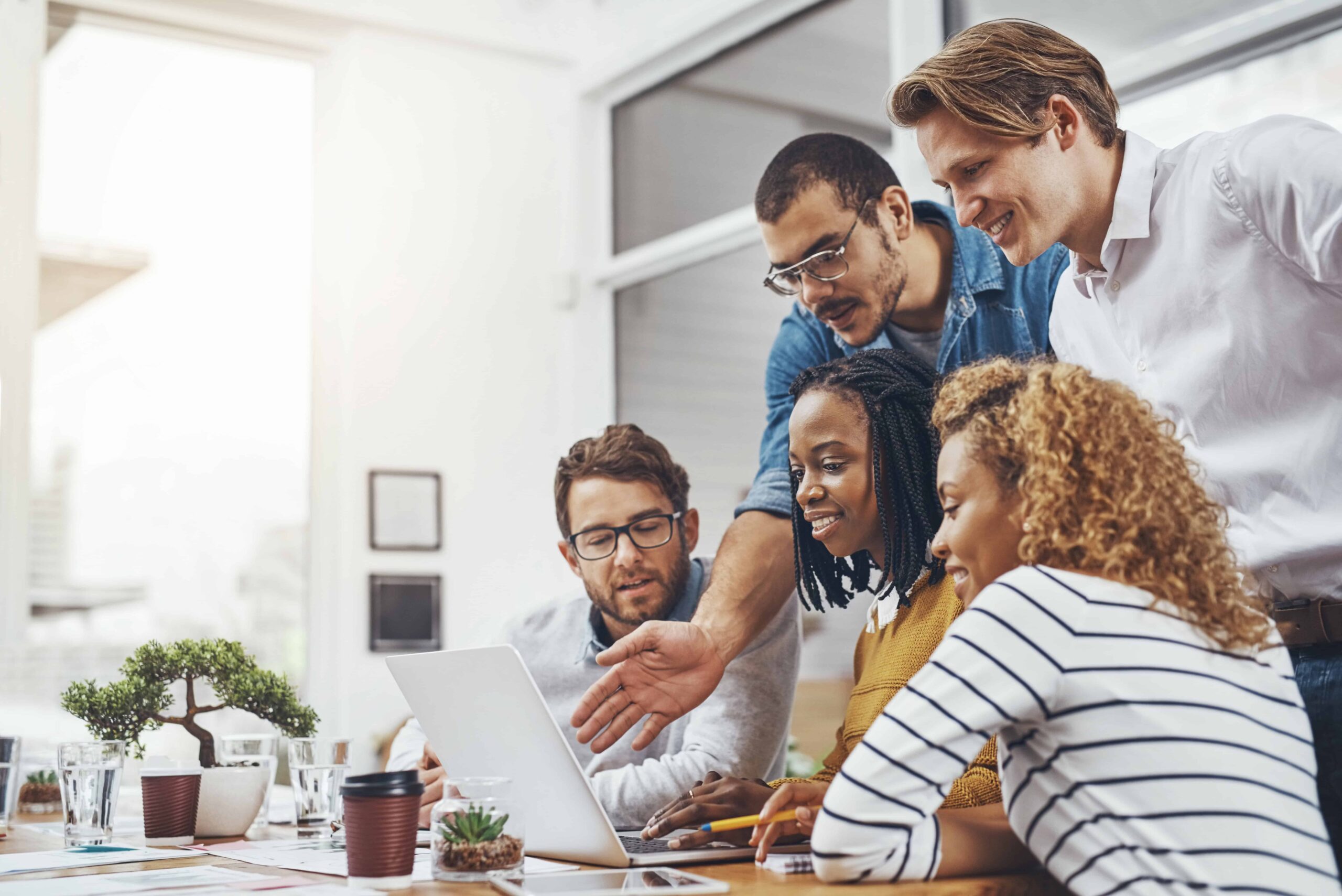 Laptop, team or business people coaching, training or question for creative solution or problem solving. Computer, group and discussion for copywriting project with manager helping interns at startup.